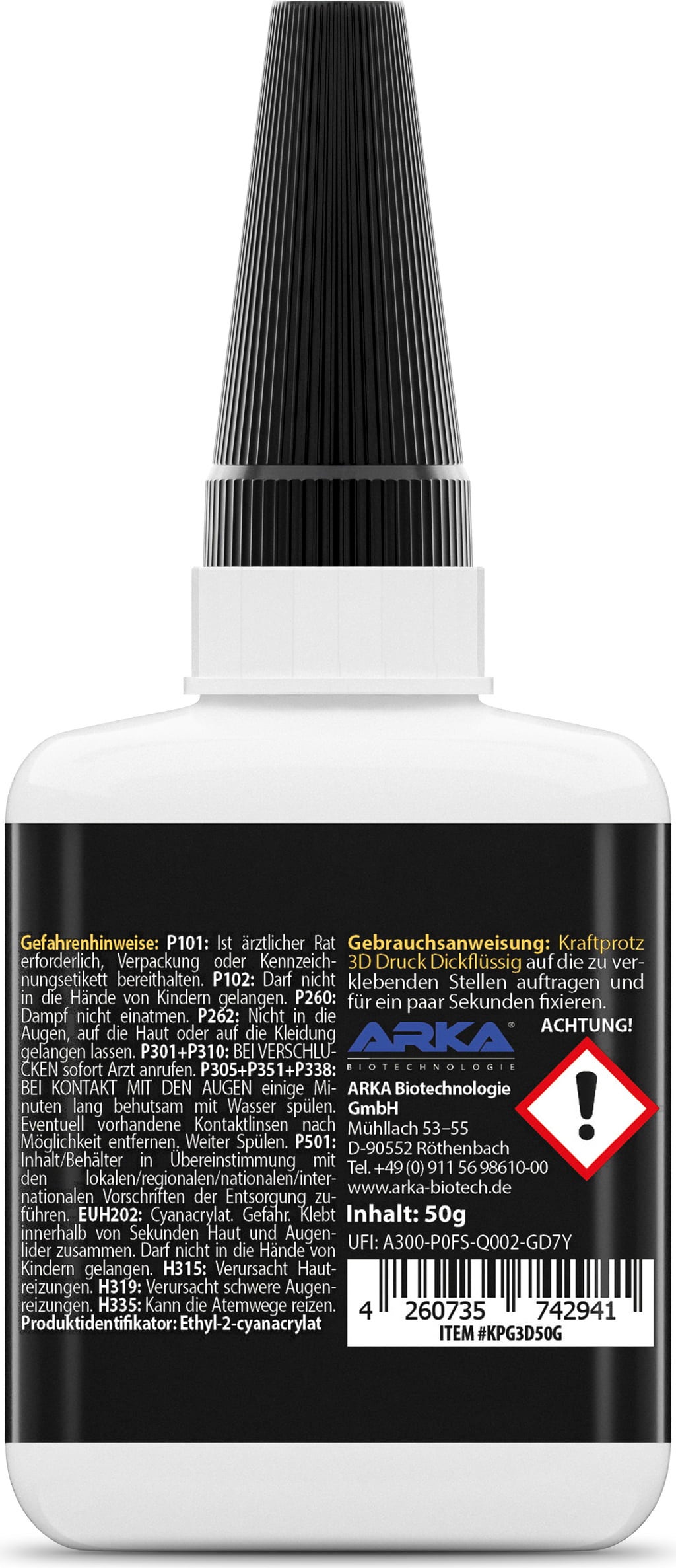 Conectează în siguranță și în mod durabil piesele tipărite 3D cu adezivul monocomponent ARKA Kraftprotz. Dezvoltat special pentru PLA, ABS, PETG și TPU, acesta nu oferă doar o conexiune extrem de puternică, dar se usucă și incredibil de rapid. Superglue-ul este rezistent la căldură, intemperii și apă, fiind astfel completarea perfectă pentru imprimanta ta 3D!