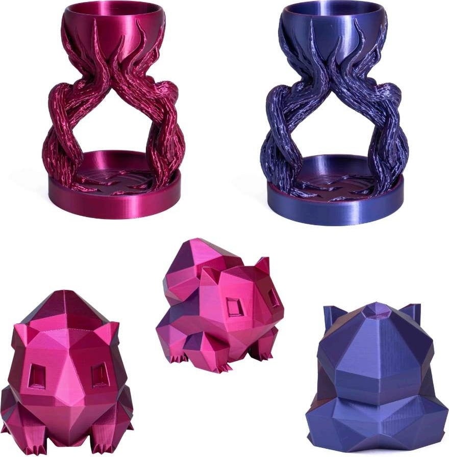 Prin cea mai avansată tehnologie de co-extrudare, PLA Silk Multicolor unește două sau chiar trei nuanțe de culoare într-un singur fir de filament. Astfel, se obțin tranziții fluide de culoare și efecte unice de sclipire, care se schimbă în funcție de unghiul de vizualizare. Fiecare imprimare devine astfel un exemplar unic, fie că este vorba de vaze, figuri, bijuterii sau accesorii decorative pentru casă.