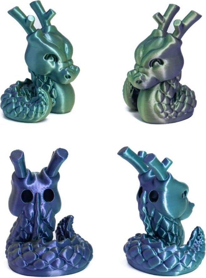 Prin tehnologia avansată de co-extrudare, PLA Silk Multicolor îmbină două sau chiar trei nuanțe de culoare în doar un singur firament. Astfel se obțin tranziții de culoare fluide și efecte sclipitoare unice, care se schimbă în funcție de unghiul de vizualizare. Fiecare imprimare devine astfel o piesă unică, fie că este vorba de vaze, figurine, bijuterii sau accesorii decorative pentru locuință.