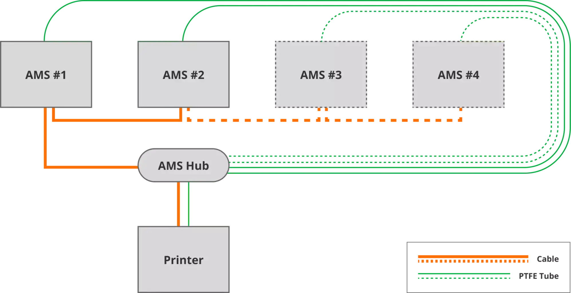 Atenție! AMS Hub conține toate accesoriile necesare pentru a conecta două (!) unități AMS la imprimantă. Pentru integrarea altor unități AMS, sunt necesare cabluri de magistrală suplimentare și tuburi PTFE. Pentru a opera un total de patru unități AMS, sunt necesare suplimentar două cabluri de magistrală cu 6 pini și două tuburi PTFE de câte 2 metri lungime.