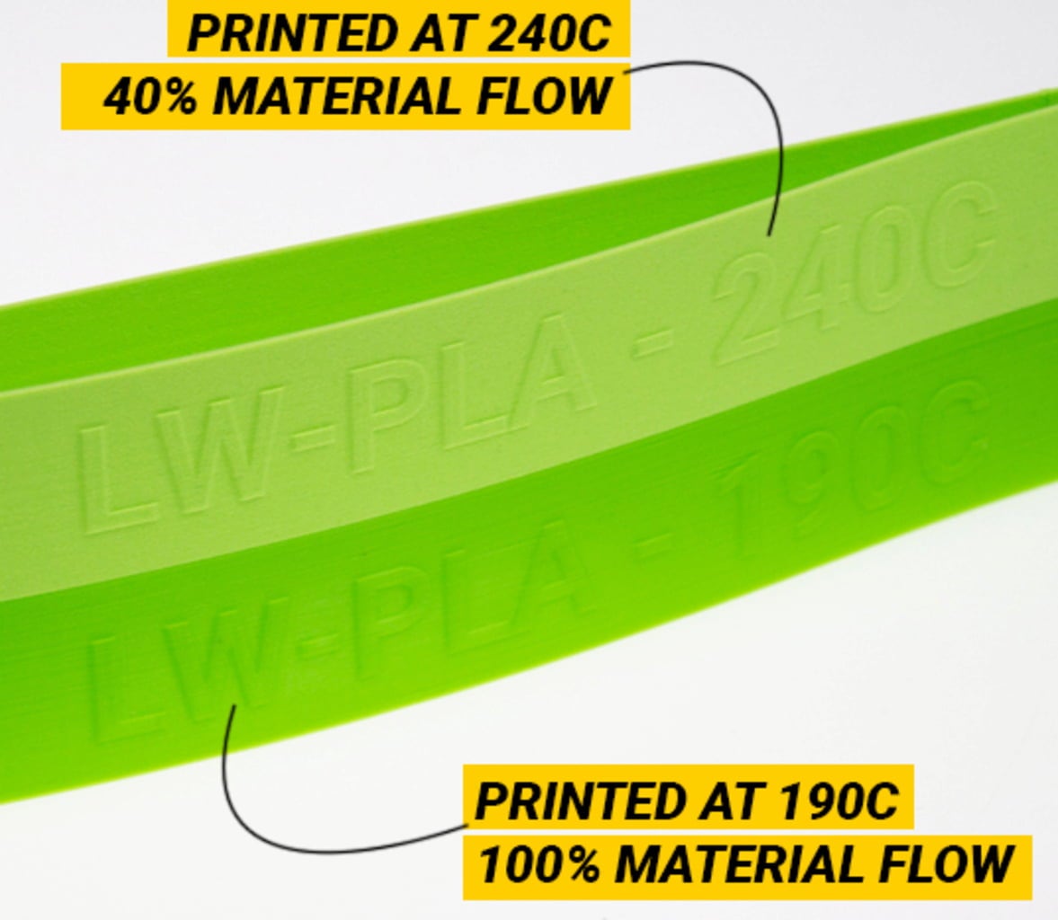 Datorită proprietății de extindere a materialului, utilizatorii pot reduce fluxul în timp ce continuă să imprime modele precise dimensional și obțin o reducere de greutate de 65% comparativ cu PLA tradițional.