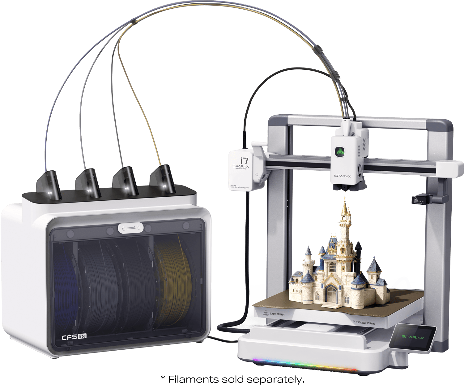 Creality SPARKX i7 Combo este concepută pentru imprimare multicolor comodă și eficientă, cu până la patru culori. În combinație cu sistemul CFS Lite, imprimanta permite schimbarea automată a culorilor, economisind timp și reducând semnificativ consumul de material.