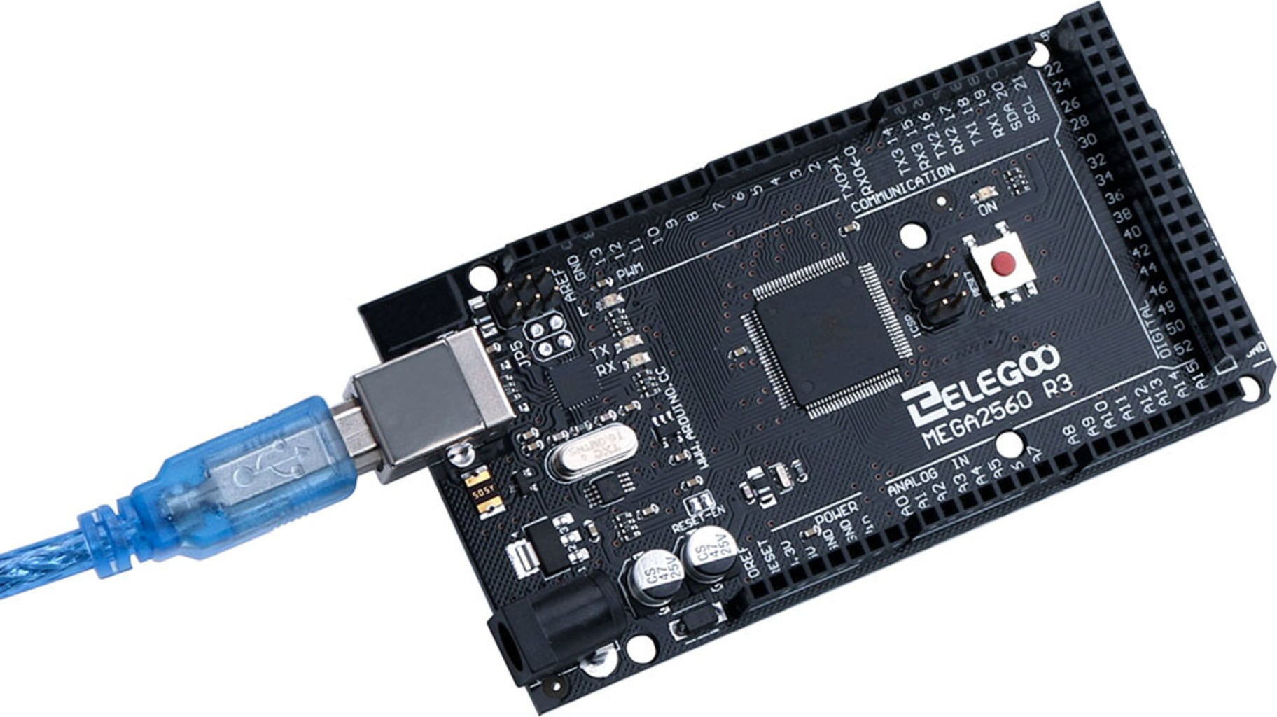 Mega 2560 Controller Board este o placă de control de dezvoltare, care se bazează pe placa de control ATmega2560 R3 și este compatibilă cu Arduino IDE. Cu cele 54 de pini digitali de I/O și 16 intrări analogice, placa este potrivită pentru proiecte mai complexe cu imprimante 3D, roboți și alte proiecte! În plus, placa dispune de 4 UART-uri, un oscilator cu cuarț de 16 MHz, un port USB, o priză de alimentare, un header ICSP și un buton de resetare.