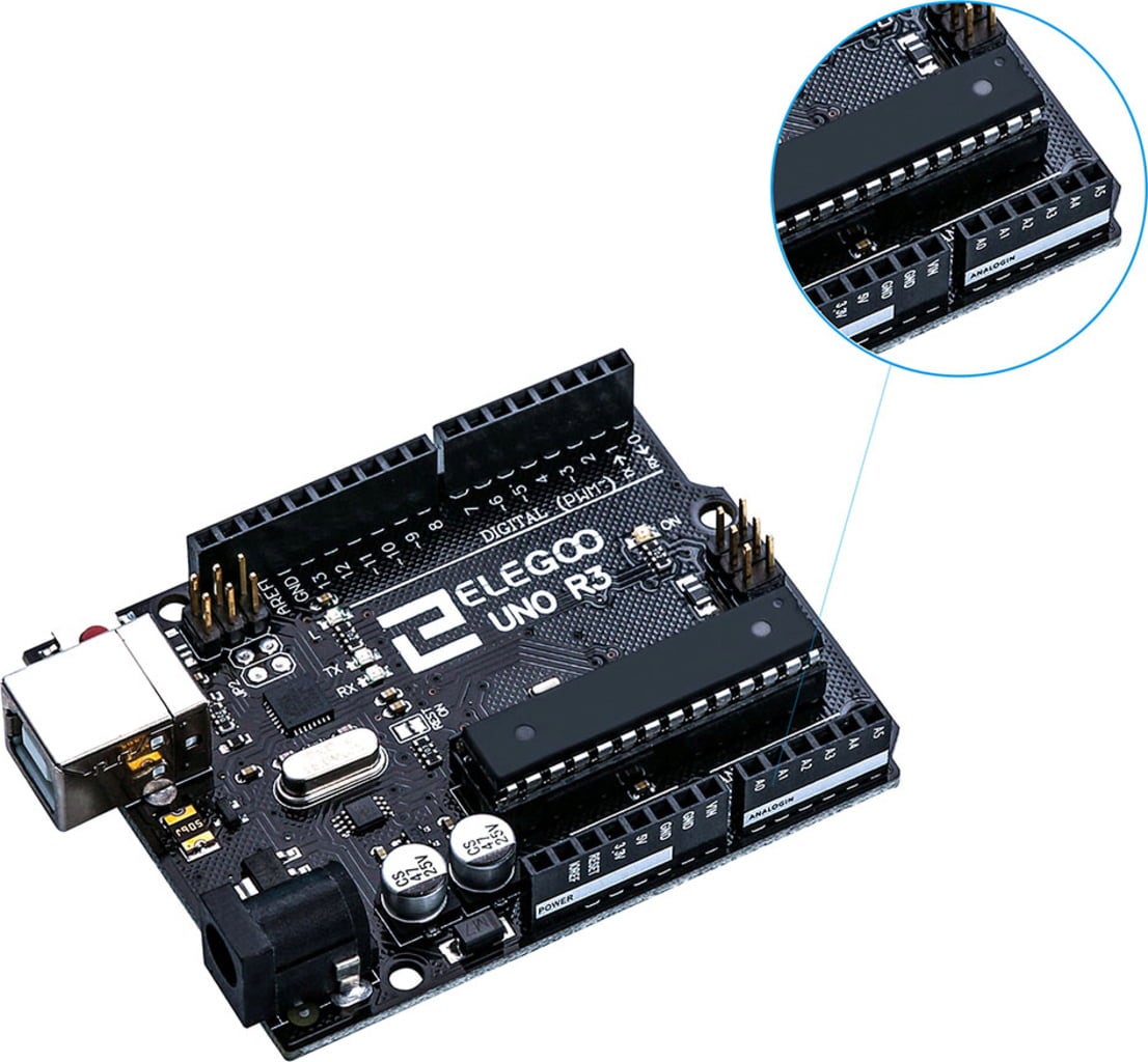 Placa de control UNO R3 de la Elegoo oferă intrarea ideală în programare! Placa este compatibilă cu Arduino IDE, și poate fi alimentată printr-o conexiune USB sau o sursă externă de alimentare.