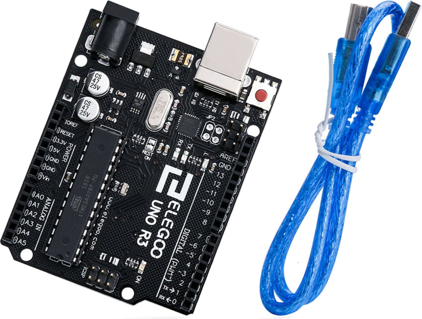 Placa de microcontroler Elegoo UNO R3 este compatibilă cu Arduino UNO R3! Placa dispune, la fel ca Arduino UNO R3, de un chip CH340C și un SMD ATmega328p, care garantează mai multă memorie și rate mai rapide de transfer.