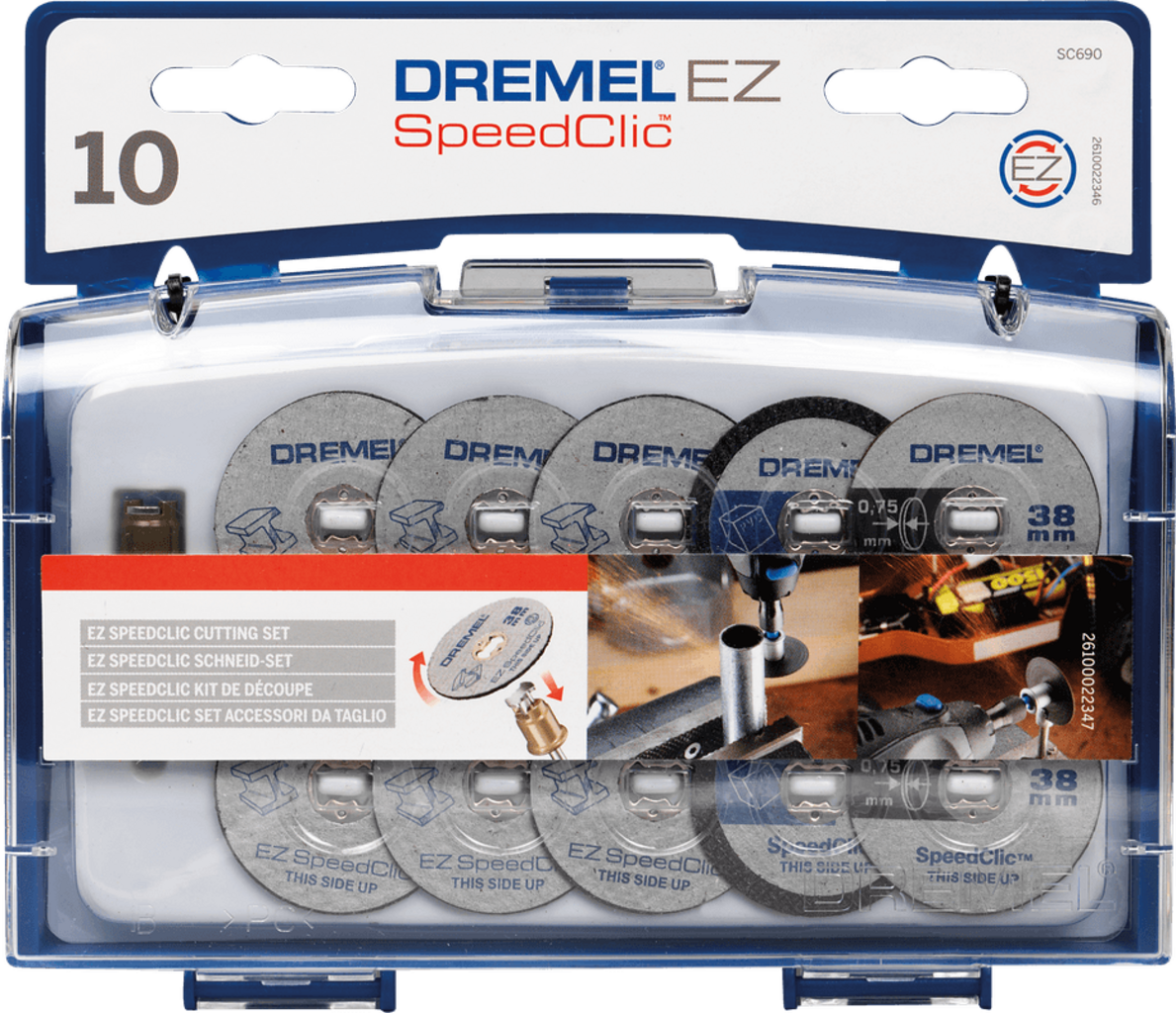 În Setul de tăiere EZ SpeedClic de la Dremel primești un arbore de prindere EZ SpeedClic și 10 discuri pentru tăierea metalului și plasticului.