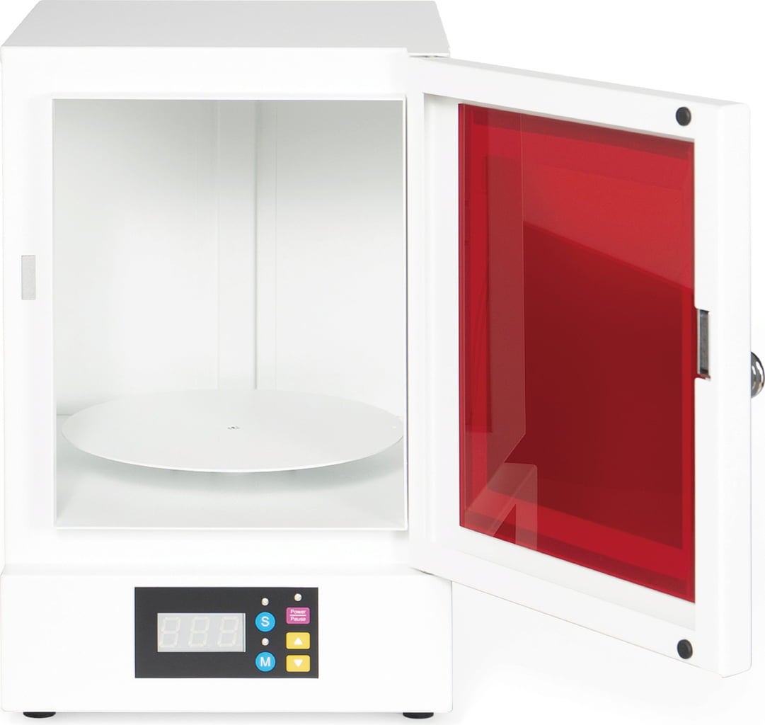 Phrozen Cure V2 este ajutorul perfect într-o clinică dentară sau într-un laborator care utilizează tehnologia de imprimare 3D. Camera compactă de polimerizare post-proces folosește LED-uri UV puternice de 365 nm, 385 nm și 405 nm pentru auscare rapidă și eficientă a modelelor printate. O platformă rotativă la 360° asigură o uscare uniformă a tuturor părților modelului.