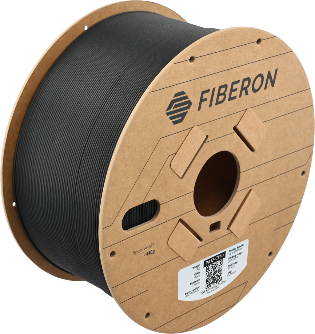 Fiberon™ PA12-CF10 de la Polymaker este un filament PA12 de înaltă performanță, întărit cu 10% fibre de carbon și care beneficiază de o sensibilitate redusă semnificativ la umiditate, facilitând astfel manipularea, depozitarea și imprimarea.