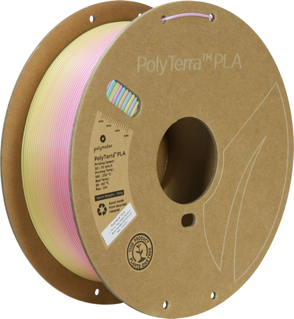 PolyTerra™️ PLA de la Polymaker este un filament sustenabil pentru imprimarea 3D, realizat pe bază de bioplastic și face parte din noua generație de filamente PLA. Acest material ecologic impresionează prin proprietăți tipice PLA, precum ușurința în utilizare, imprimarea facilă și fiabilitatea, și prezintă caracteristici mecanice excelente, ceea ce îl face potrivit pentru o gamă largă de aplicații.