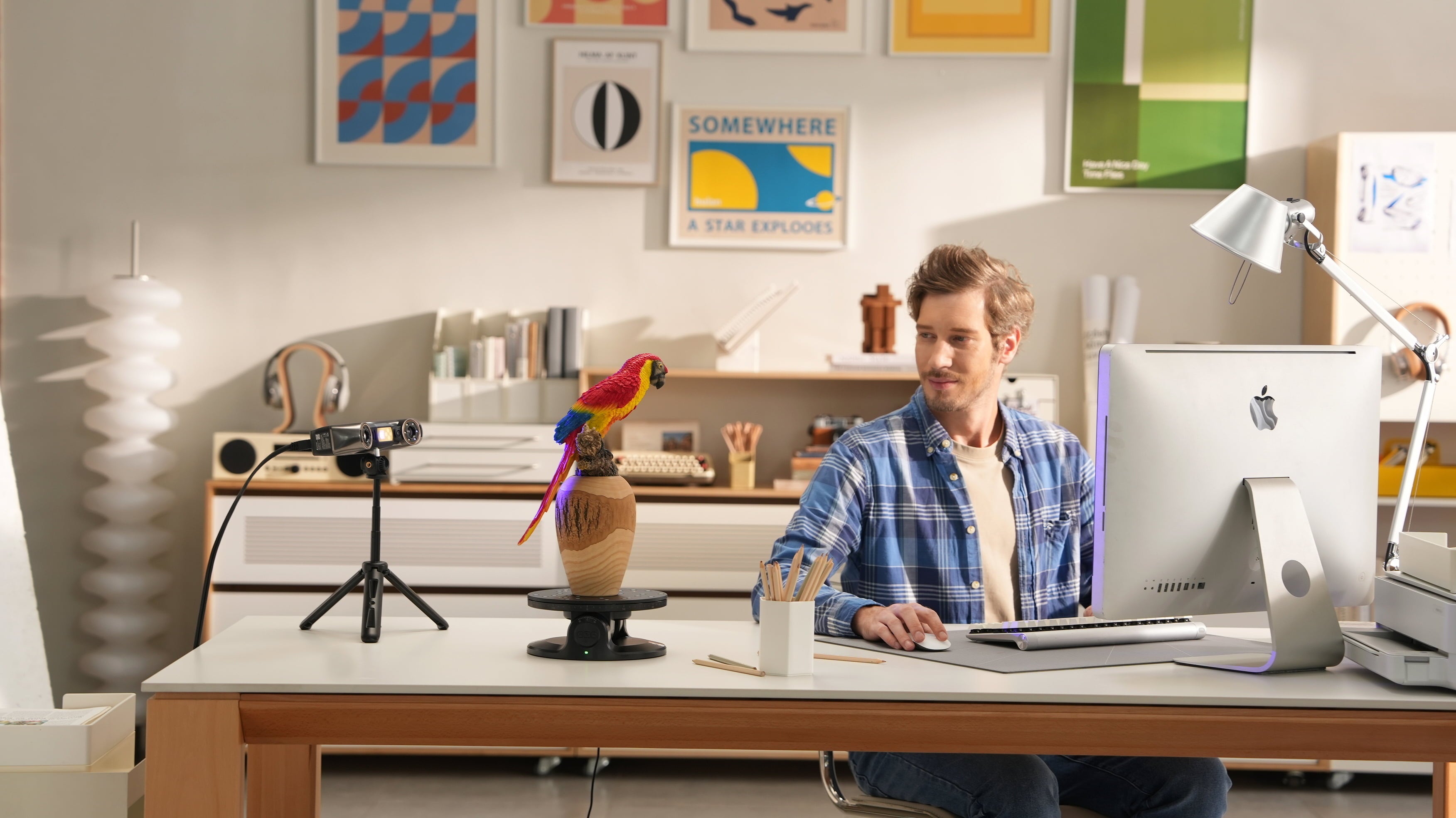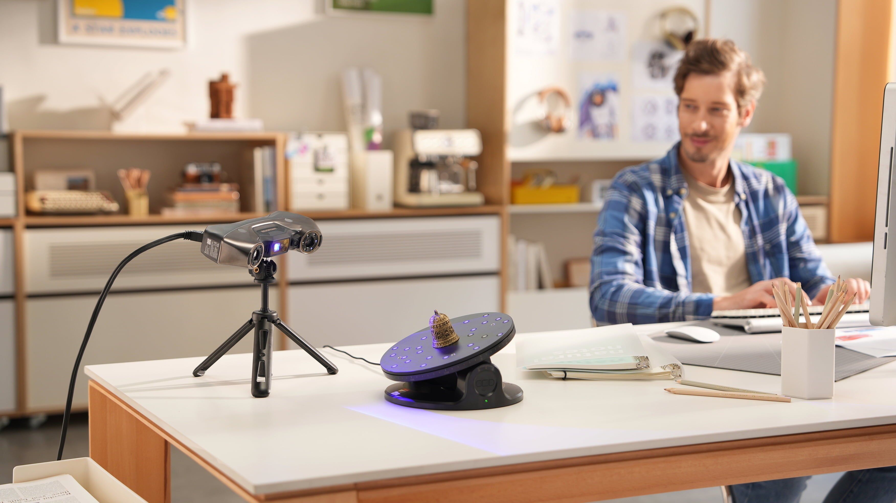 Camera HD-RGB integrată captează culorile reale ale suprafeței pentru modele 3D detaliate. Cu modul Platformă Rotativă Automată, alinierea texturii devine și mai precisă, oferindu-ți rezultate consistente și profesionale.