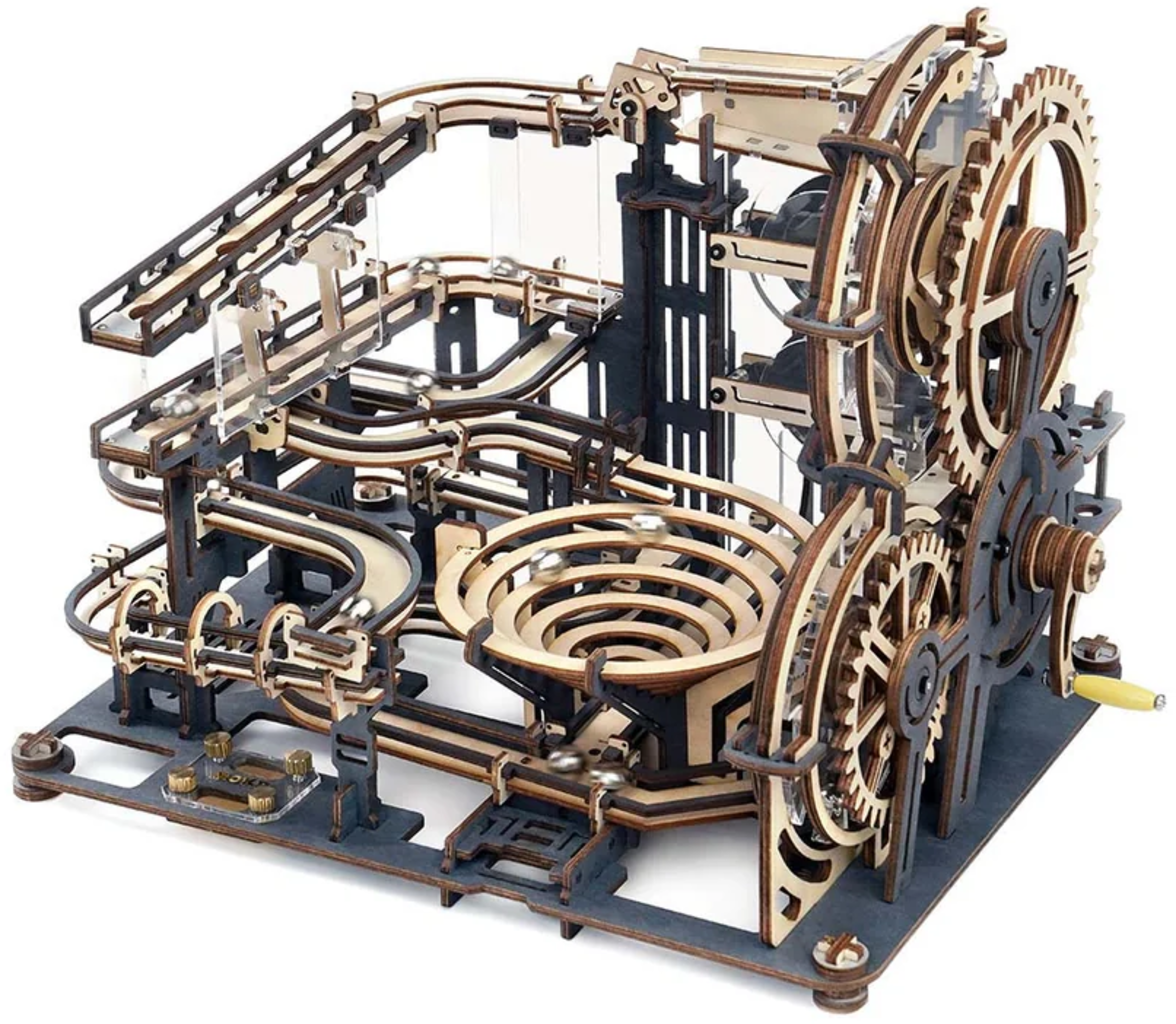 Fizică în loc de priză: În loc să folosească electricitate, Marble Night City se bazează pe fizica pură: cu un mâner rotativ, lansezi bilele de oțel în călătoria lor, iar gravitația face restul. Traseele construite cu precizie ghidează bilele prin oraș – vizibile prin elementele acrilice transparente care îți arată fiecare looping și ramificație. Rezultatul? O interacțiune hipnotică între mișcare, mecanică și design, care te face să stai pe loc și să observi fascinat.