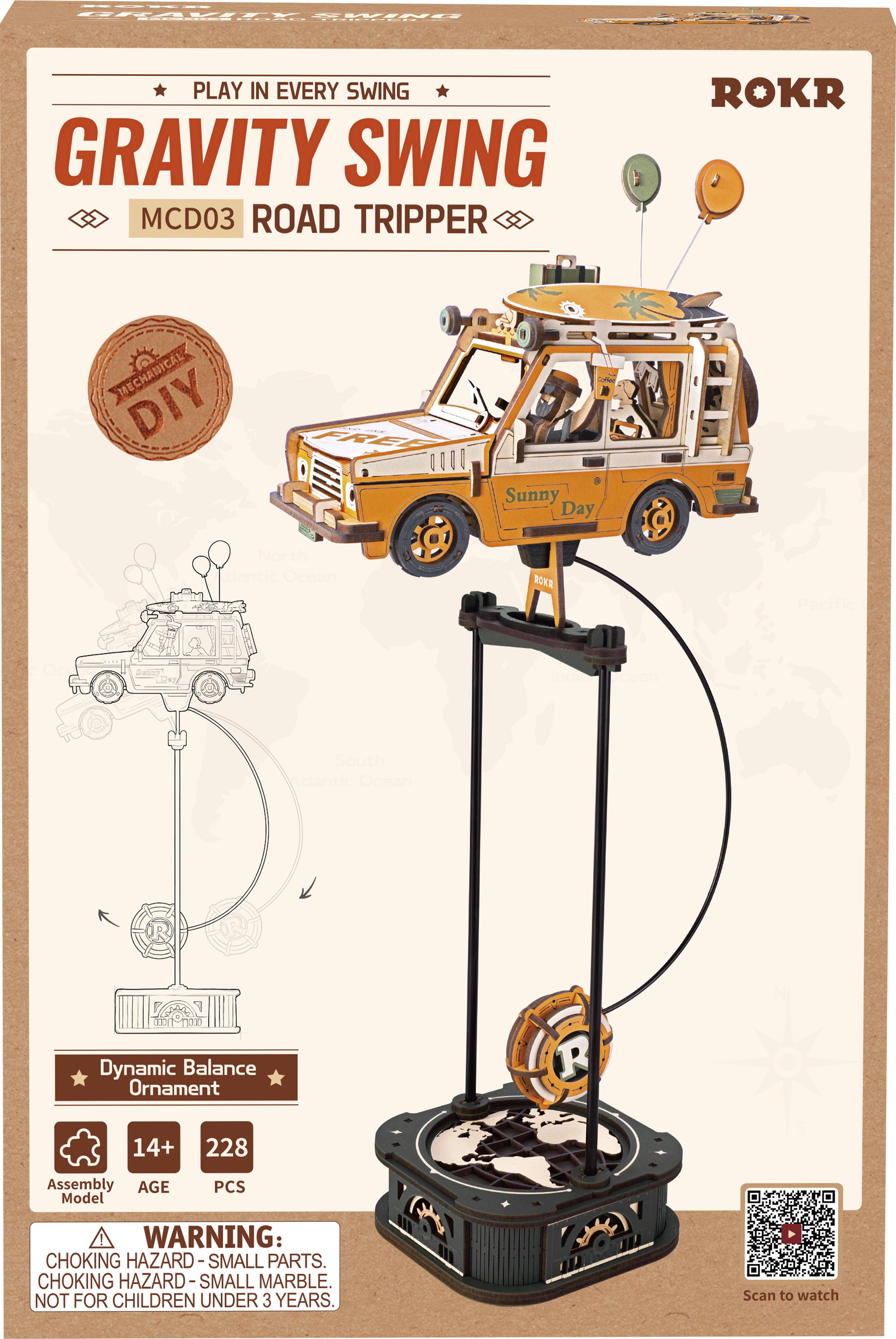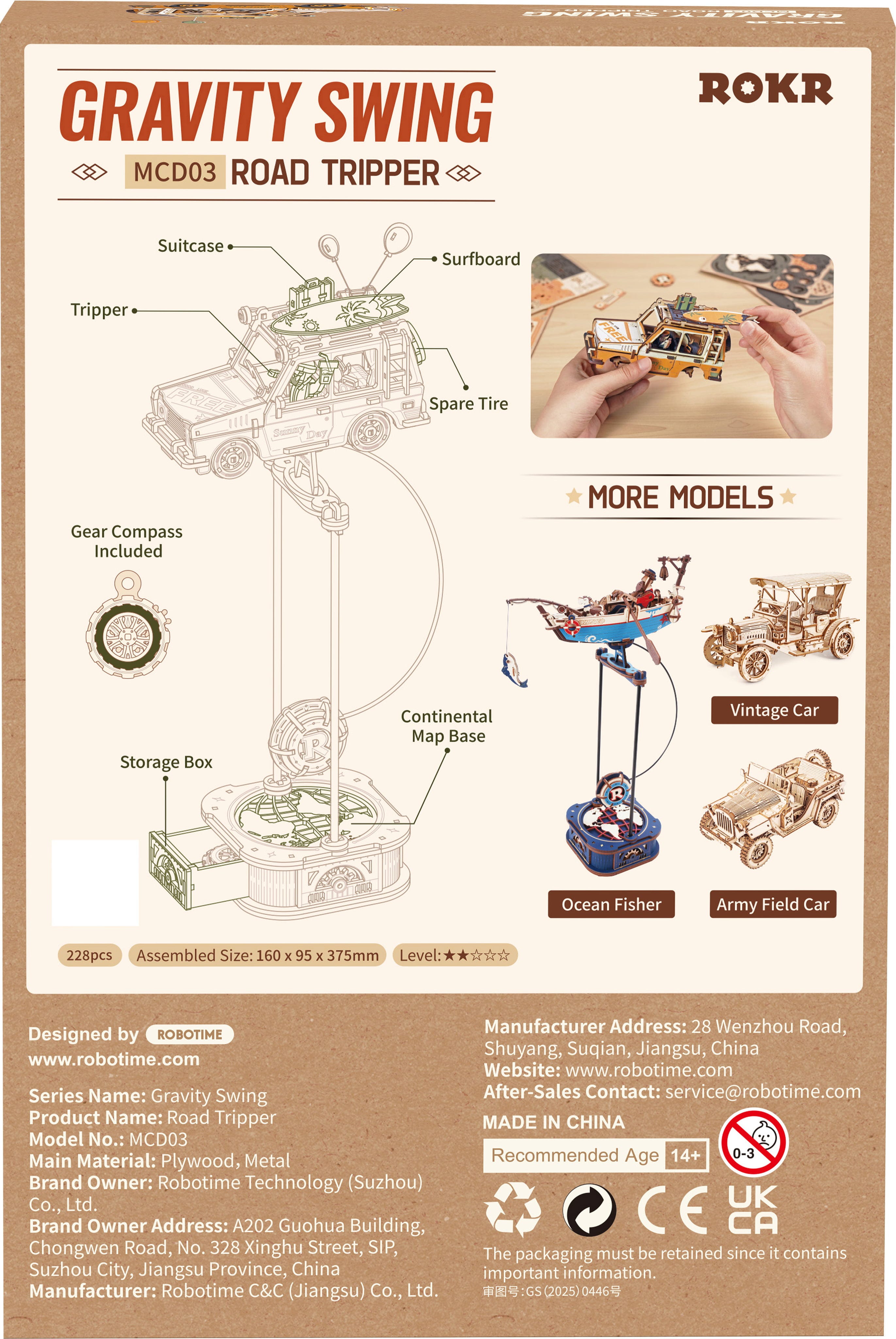 Chitara ambalată, valiza bine fixată, placa de surf prinsă pe acoperiș și hai la drum! ROKR Road Tripper este un puzzle 3D de lemn ce surprinde acea senzație specială: de a fi pe drum, fără destinație, cu timp liber și bună dispoziție în bagaj. Baloane flutură, un însoțitor blănos se află în mașină - și, pe măsură ce construiești, ia naștere, pas cu pas, o mică poveste de călătorie din lemn.