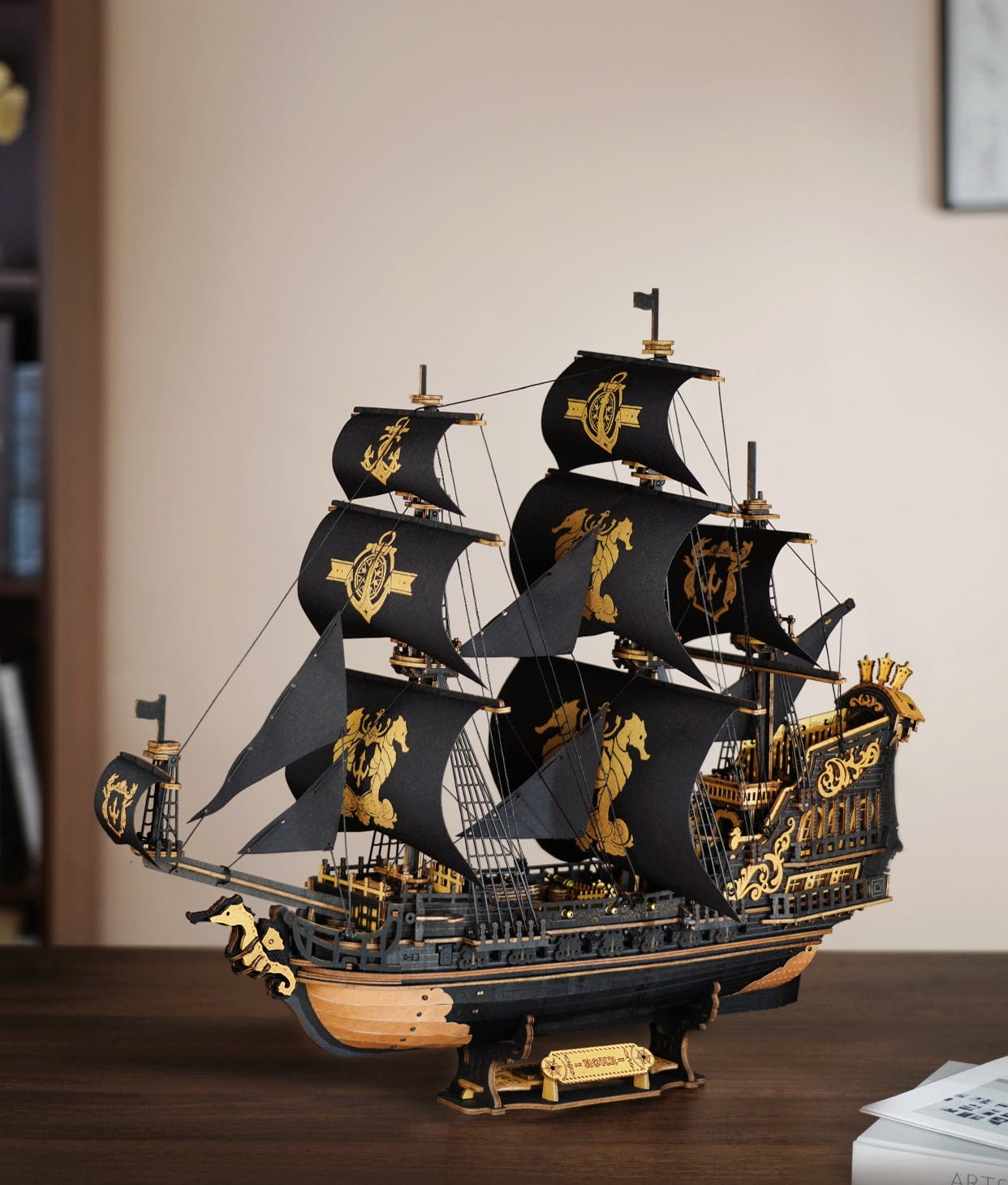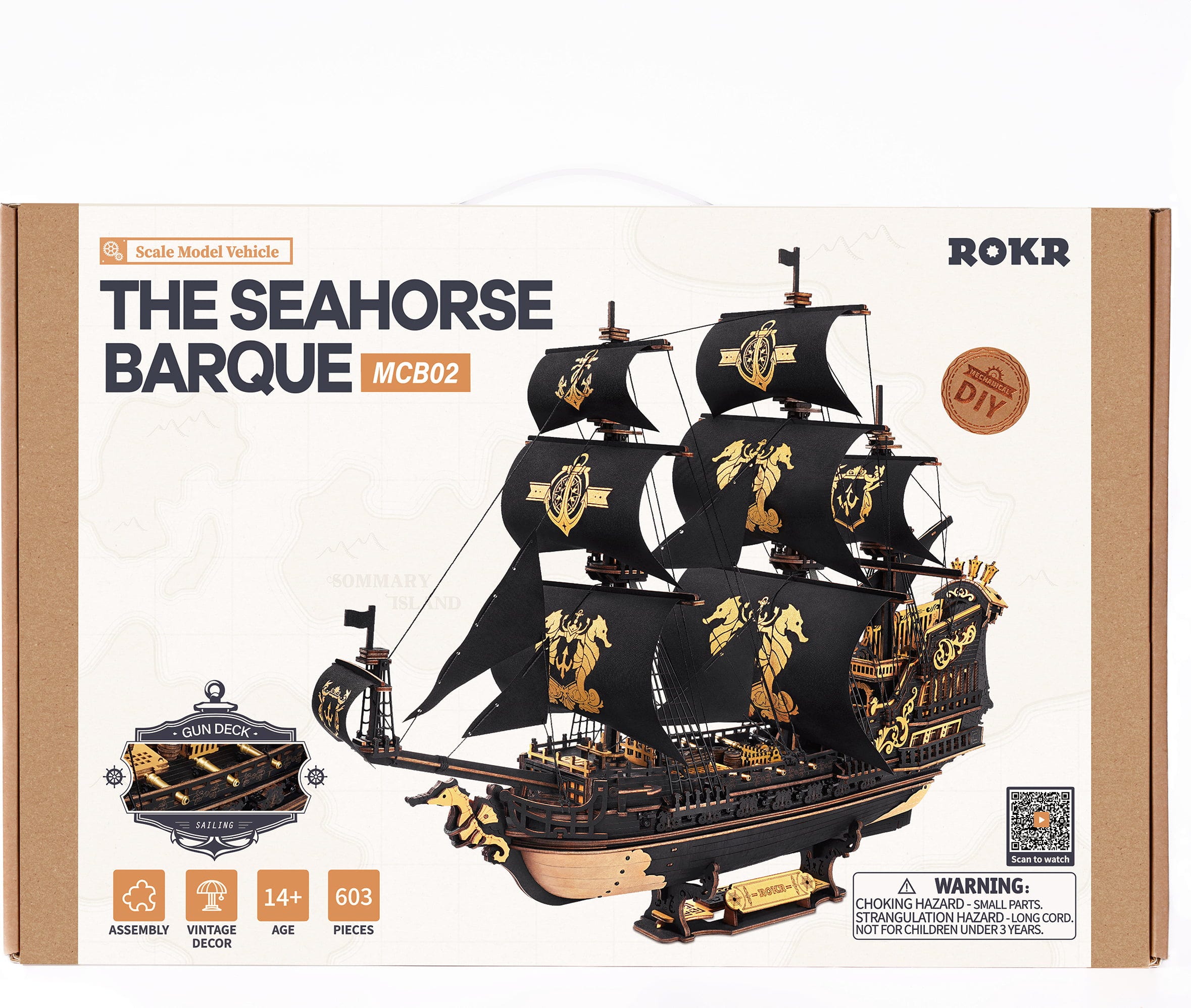 Negura acoperă apa. Lemnul scârțâie. Velele se întind în vânt. ROKR The Seahorse Barque nu este o navă obișnuită, este o apariție. Un puzzle 3D din lemn majestuos, care te transportă într-o lume maritimă întunecată, plină de putere, mister și istorie. Construindu-l, ia naștere bucată cu bucată un barc impunător, ce pare că stă gata să pornească pe mare în orice clipă.