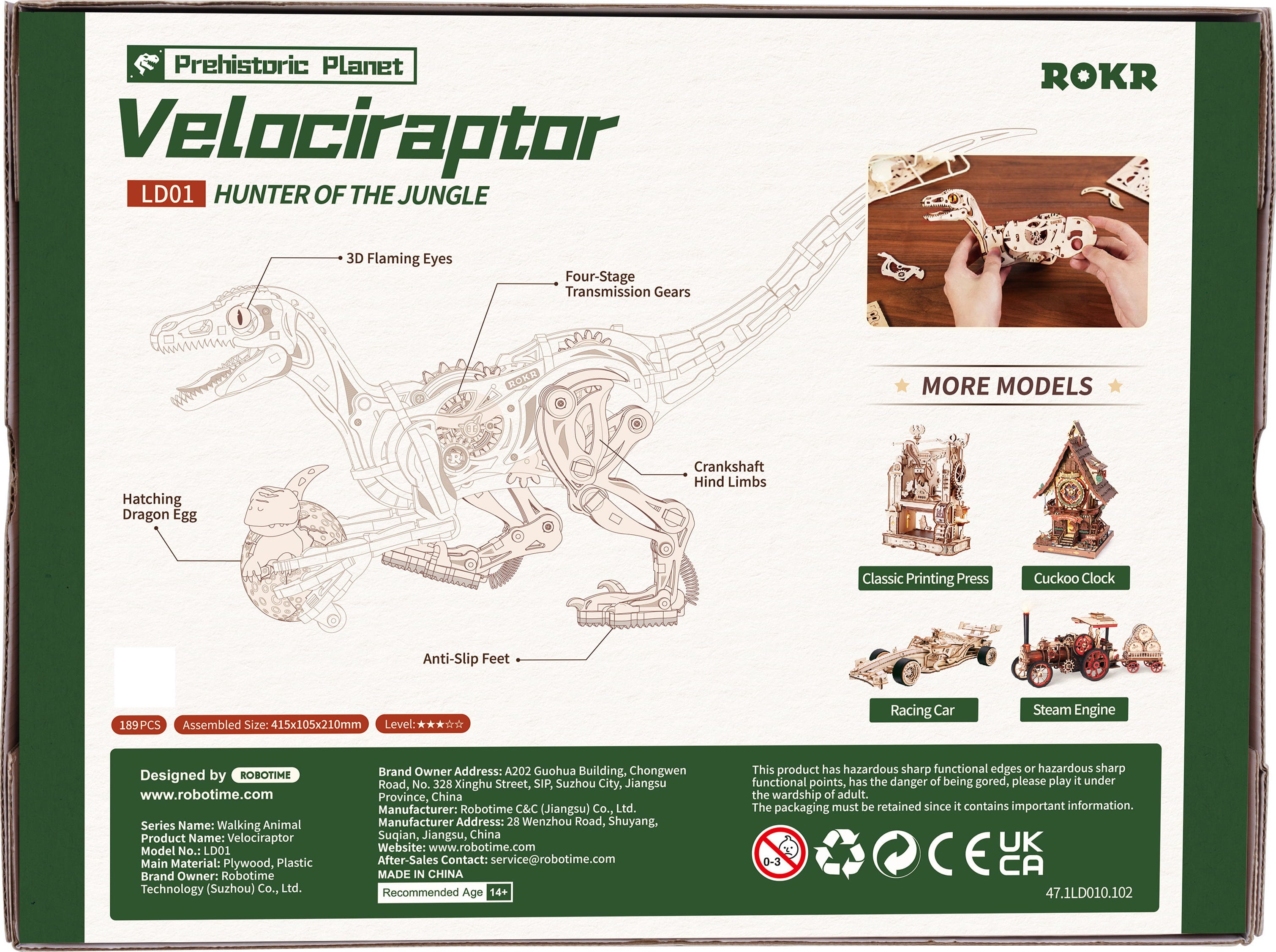 ROKR Velociraptor este un puzzle mecanic 3D din lemn, care combină mișcarea, tensiunea și forța primordială. Cu forma sa zveltă, squeletoasă, gheare ascuțite, dinți zimțați și ochi strălucitori de culoare chihlimbarului, pare că tocmai a scăpat din Cretacic – pregătit pentru următorul sprint.