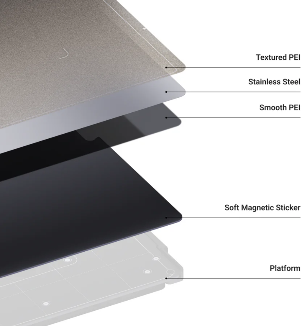 Partea texturată PEI oferă o aderență excelentă pentru imprimări mari, complexe sau funcționale, în timp ce partea netedă este perfectă pentru modele mici până la medii, cu o suprafață impecabilă.