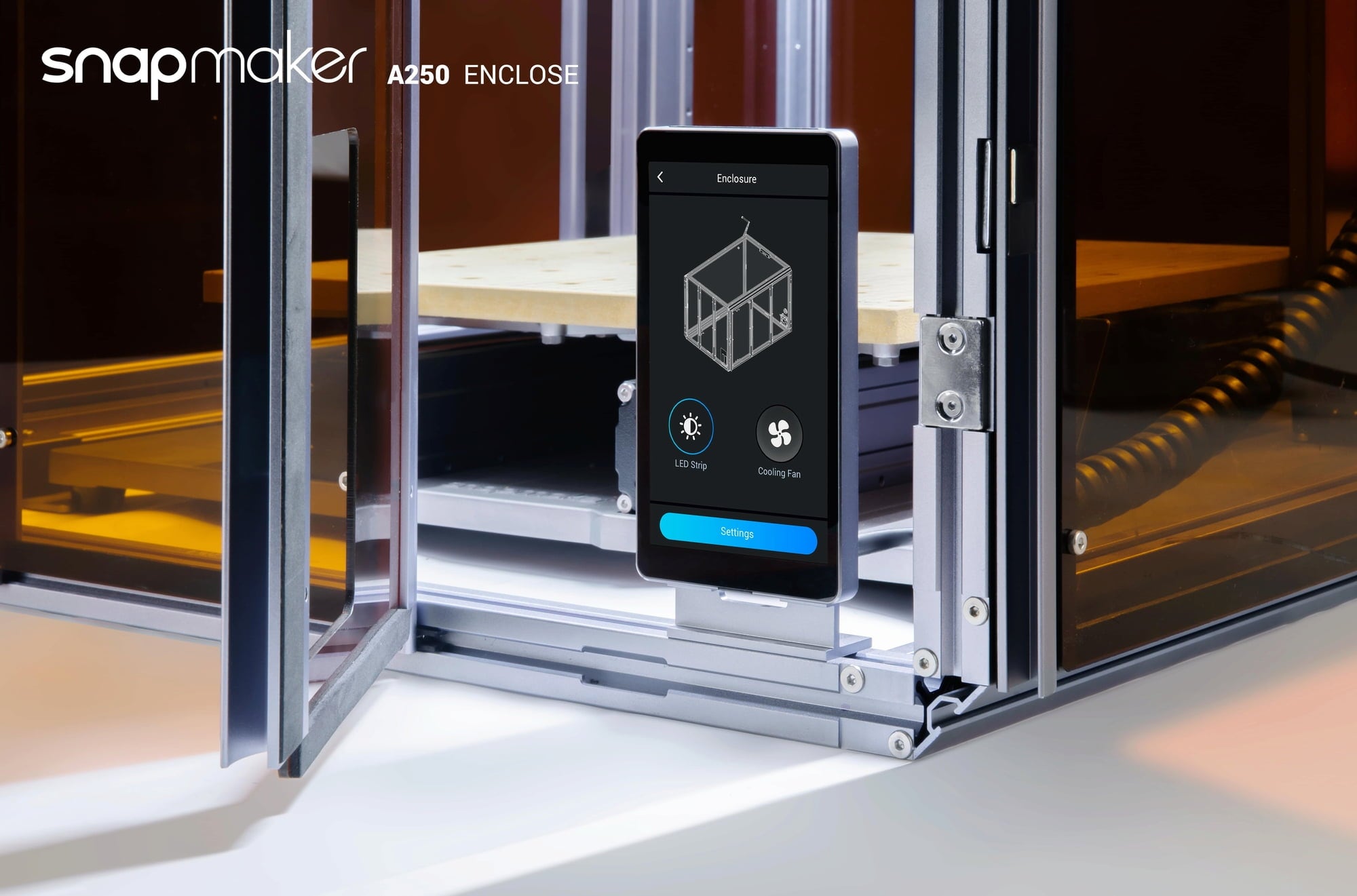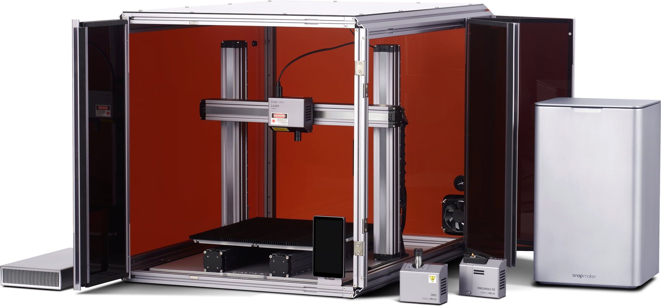 Carcasa Snapmaker 2.0 este fabricată dintr-un aliaj de aluminiu de calitate avionică și panouri din acrilic care filtrează laserul. Montarea este simplă, deoarece ușile ajung deja preasamblate.