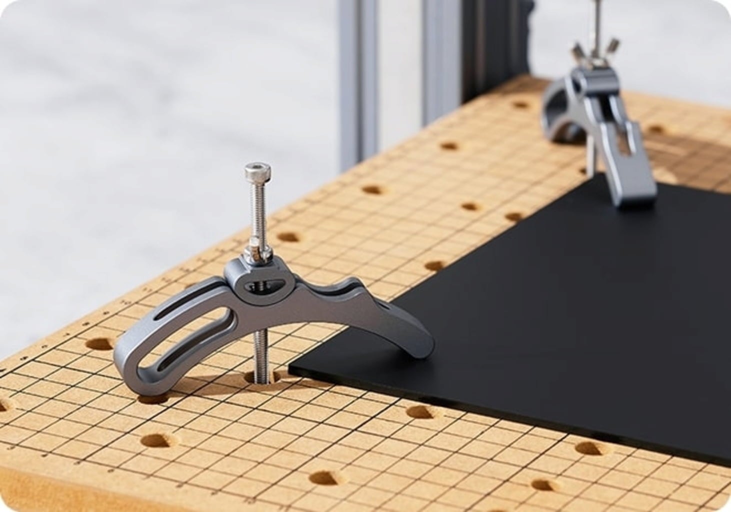 Snapmaker 2.0 vine cu o placă MDF detașabilă care protejează patul de deteriorare și oferă o suprafață netedă pentru frezare CNC precisă. Seturile de cleme incluse pot fi folosite pentru a fixa materialele în mod simplu și fiabil.