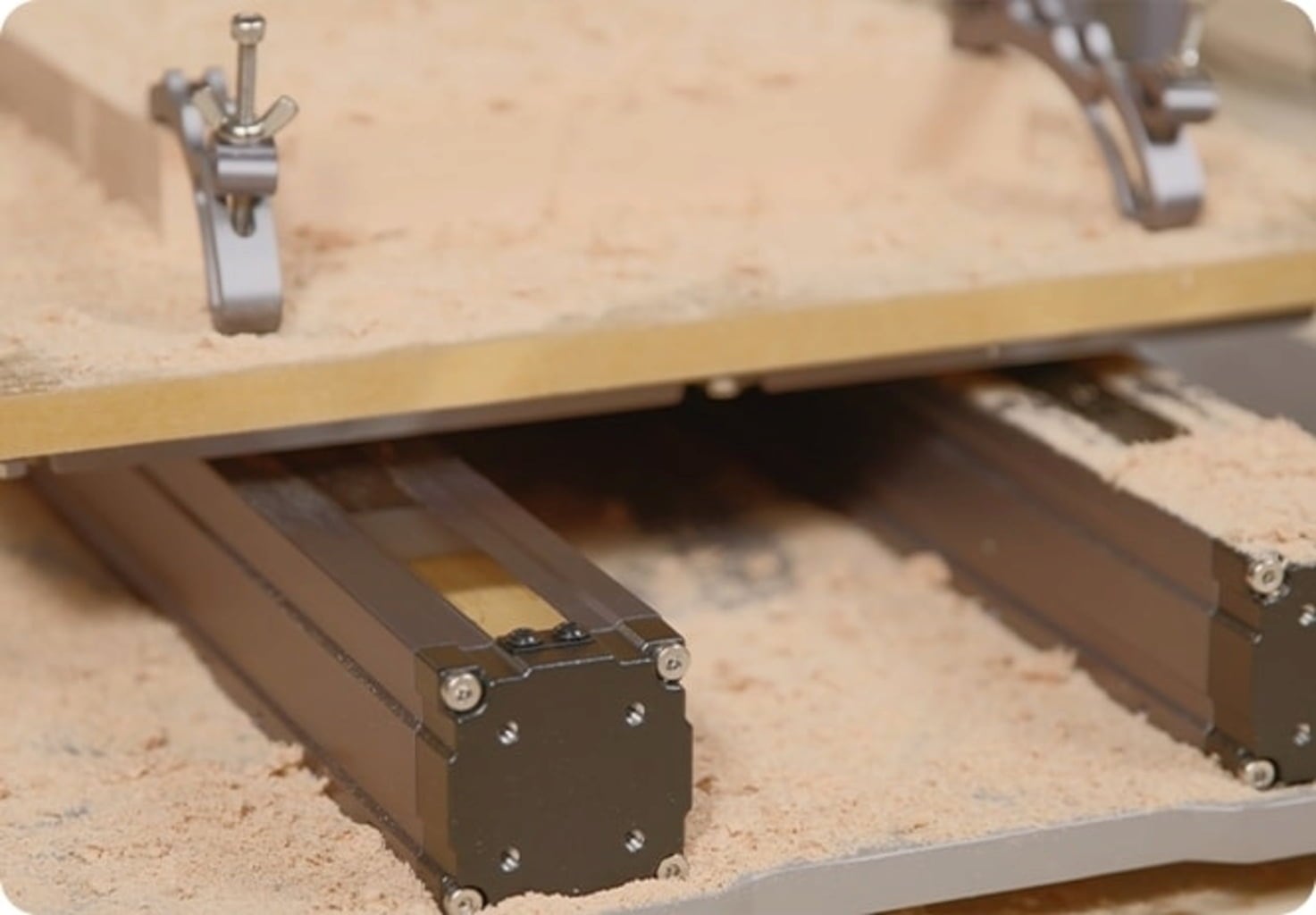 Deoarece axul de lucru, cipul driver și piesele de precizie sunt complet închise în carcasă, depunerile de murdărie sunt eliminate. Acest lucru duce la o durabilitate îmbunătățită și o întreținere mai ușoară a dispozitivului. - Placă MDF și seturi de cleme
