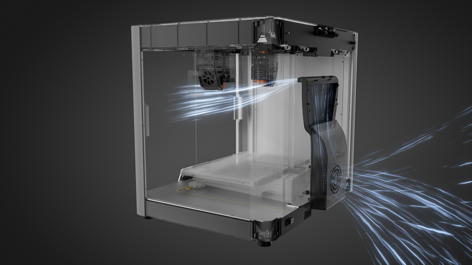 Răcitorul special utilizează un canal de ventilator îngust care permite circulația aerului pe o zonă mare de imprimare. Astfel, modelele imprimate sunt răcite rapid chiar și la viteze maxime, iar temperaturile ambientale sunt reduse. Încă un avantaj este că nu mai trebuie să îndepărtezi capacul atunci când imprimi cu materiale precum PLA. Foarte practic!