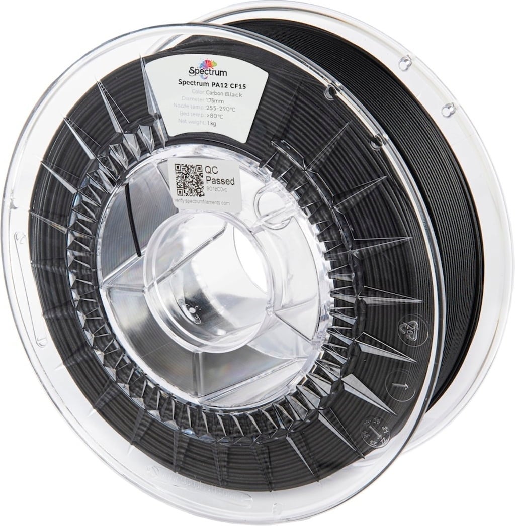 PA12 CF15 de la Spectrum este un filament de nylon tehnic, întărit cu 15 % fibre de carbon. Acesta combină o rezistență extraordinară, rigiditate și stabilitate dimensională cu o rezistență termică impresionantă de până la 170 °C. Datorită rezistenței sale la substanțe chimice și umiditate, PA12 CF15 este alegerea perfectă pentru aplicații industriale și medii solicitante unde precizia și durabilitatea sunt esențiale.