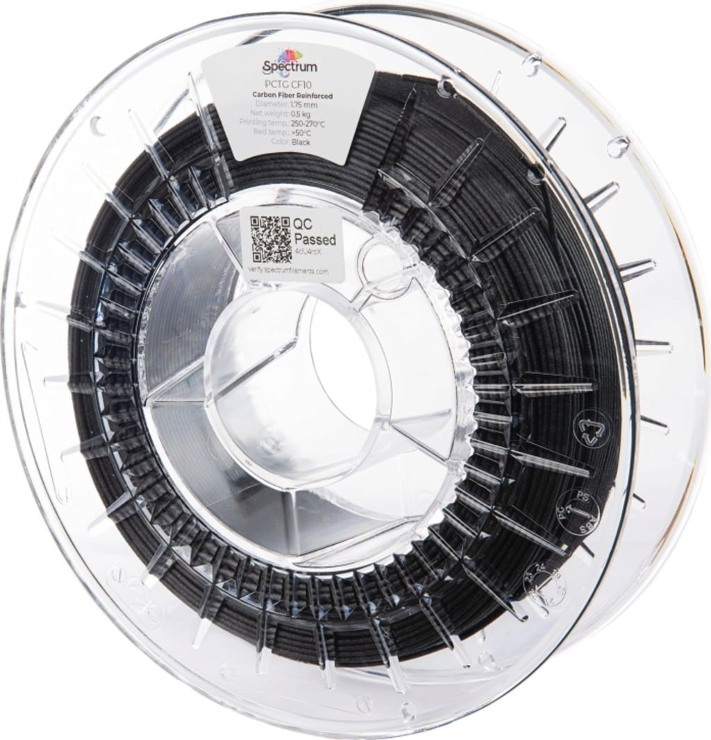 PCTG CF10 de la Spectrum este un compus pe bază de PCTG, îmbogățit cu un conținut de 10% fibre de carbon. Datorită fibrelor de carbon, materialul prezintă o rezistență ridicată la temperatură, având o temperatură de deformare termică de 78 °C, ceea ce ajută la prevenirea contracției. În plus, fibrele de carbon conferă pieselor și componentelor imprimate un finisaj mat de carbon.