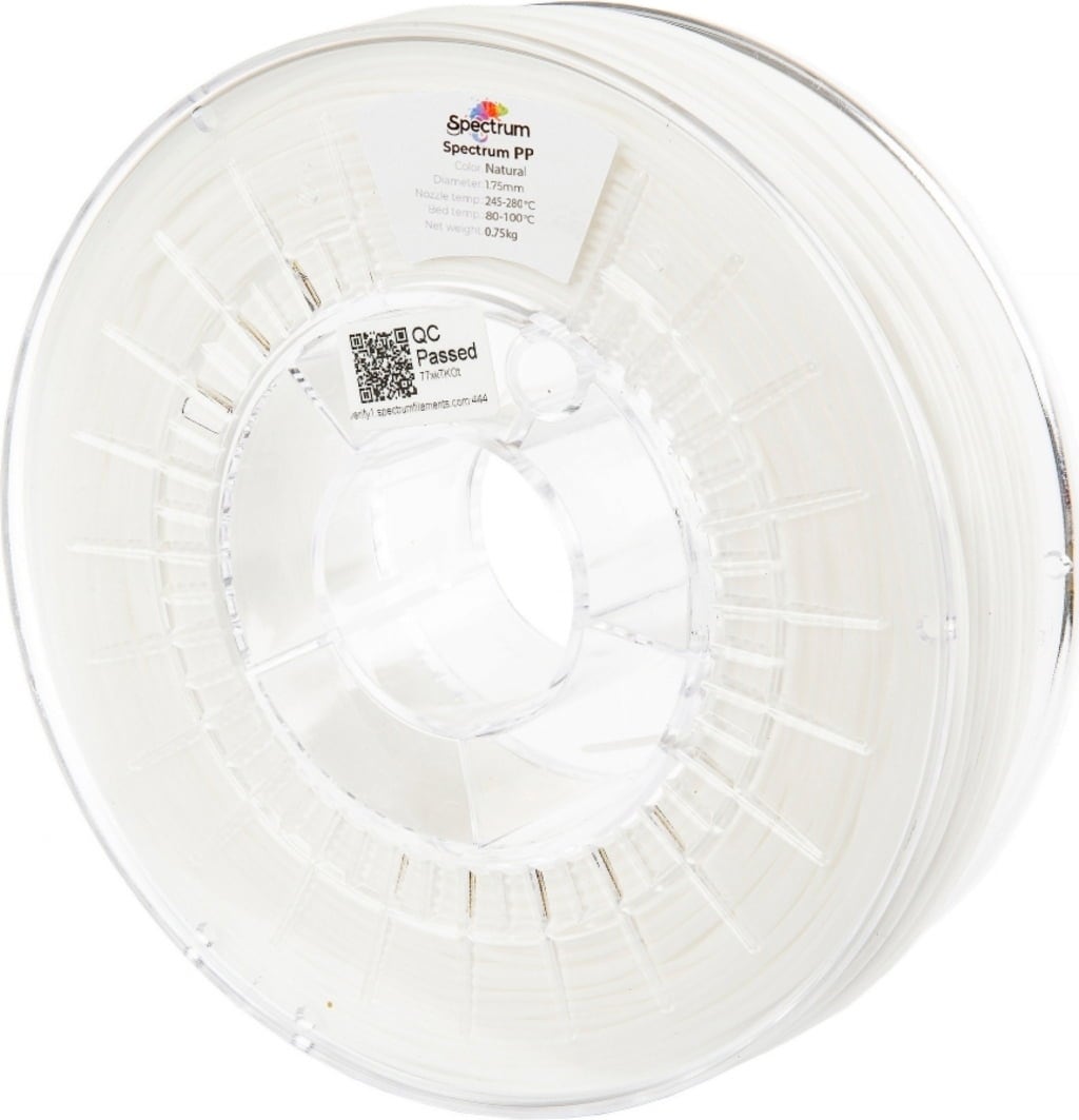 Spectrum PP este un filament de polipropilenă de înaltă performanță, dezvoltat special pentru aplicații în care sunt necesare greutatea redusă, flexibilitatea mare, precum și rezistența chimică și mecanică excelentă. Materialul combină rezistența structurală cu flexibilitatea extraordinară și atinge o alungire de până la 600% fără rupere. Cu o duritate Shore de 50D, Spectrum PP prezintă o rezistență ridicată la abraziune, crăpare și uzură și oferă, de asemenea, rezistență completă la apă, detergenți și multe substanțe chimice.