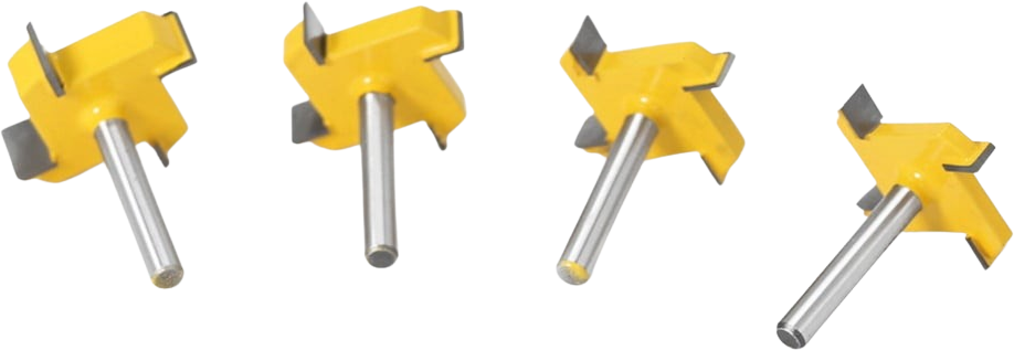 Aceasta este un set de 4 freze cu patru tăișuri în formă de T de la Two Trees. Frezele din oțel carbon sunt dotate cu un cap de tăiere din aliaj YG6 și sunt utilizate pentru realizarea de șanțuri în lemn.